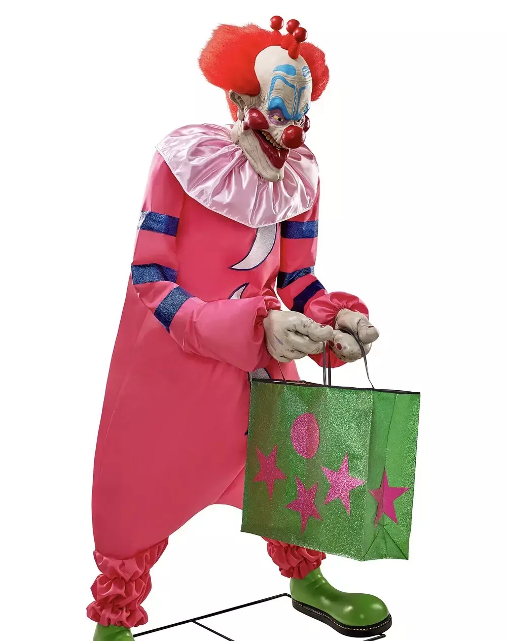Si ves algún títere de sombras gigante este Halloween, ten cuidado, porque eso solo puede significar una cosa. ¡Los Payasos Asesinos del Espacio Exterior han vuelto y están listos para causar un caos alocado estas fiestas! Convierte tu exhibición de Halloween en un circo de los Payasos Asesinos este Halloween con este animatrónico Slim con licencia oficial. Como uno de los payasos más destacados de la película, Slim no debe tomarse a la ligera. Con su característico mono de payaso rosa brillante, su cabellera naranja con mini globos y su sonrisa siniestra, Slim siempre está a la caza de cualquier humano indefenso que pueda capturar para alimentar a su tripulación. Equipado con su bolsa verde de palomitas que tiene en la película, ¡acércate demasiado y podrías encogerte y terminar siendo el próximo bocadillo delicioso de los Payasos Asesinos!